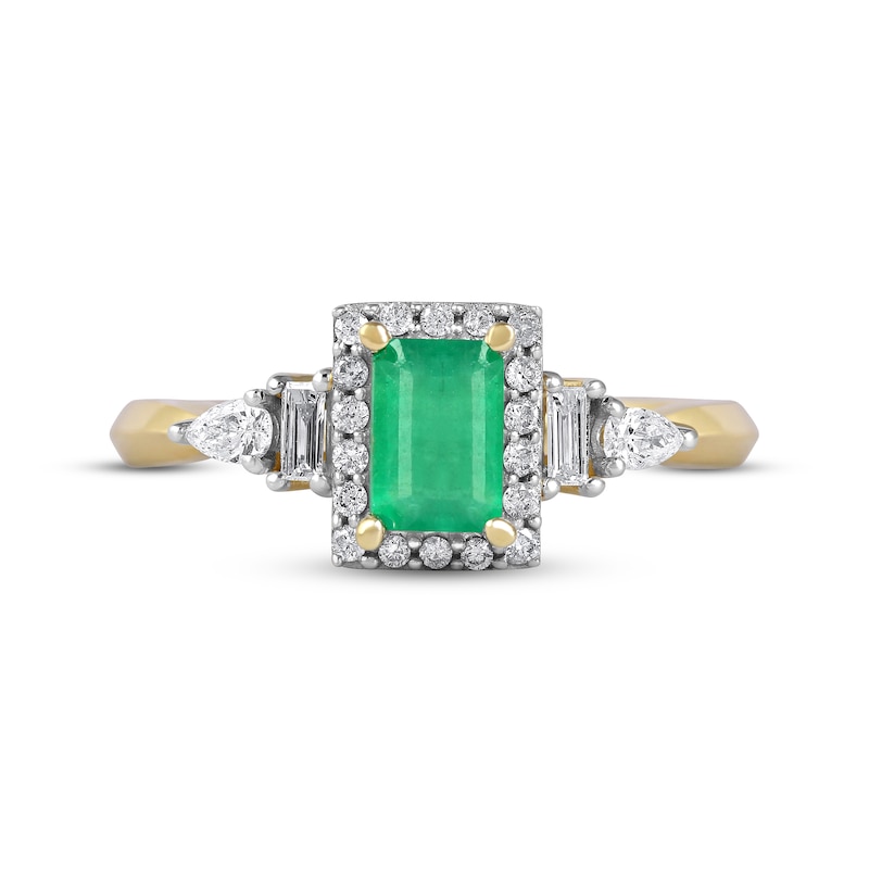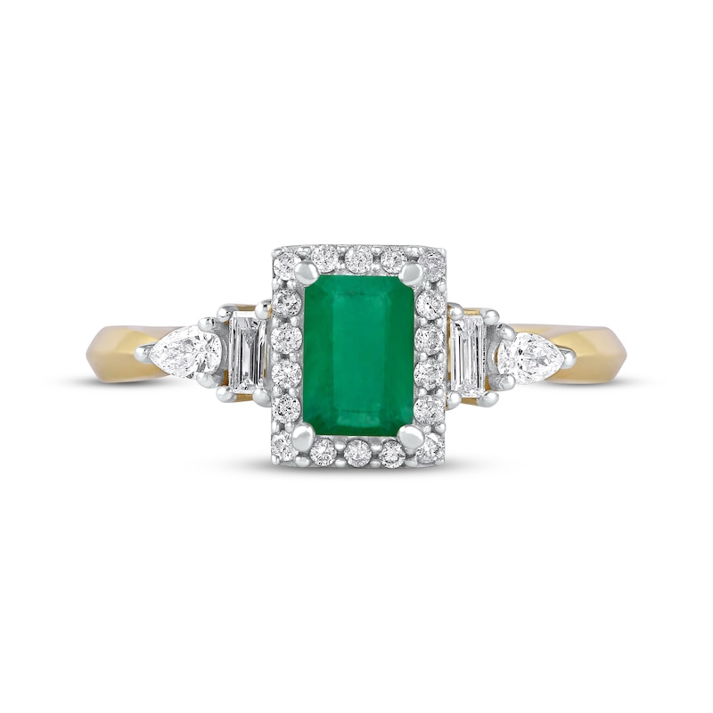 This gorgeous 10K yellow gold ring for her from Natural Precious Gemstones by KAY features an iconic emerald-cut emerald at its center, surrounded by a halo of sparkling round-cut diamonds. Baguette-cut and pear-shaped diamonds flank each side of the band, giving the ring a total diamond weight of 1/3 carat.