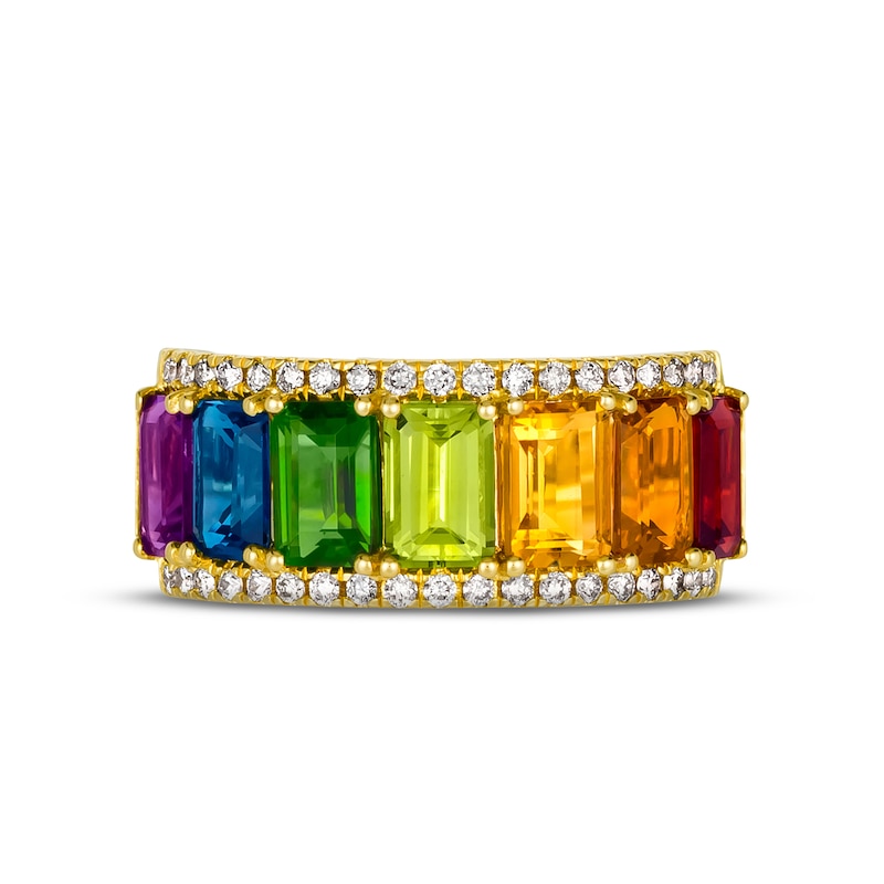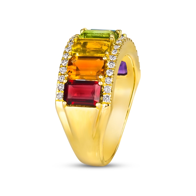 Dazzling with a spectrum of lively colors, this gorgeous Le Vian Creme Brulee® ring features emerald-cut gemstones including a Dark Amethyst, a Deep Sea Blue Topaz™, a Pistachio Diopside®, a Green Apple Peridot™, two Cinnamon Citrine® gemstones, and a Pomegranate Garnet™. Sparkling Nude Diamonds™ trace the edges of the band, which is styled in sweet 14K Honey Gold™. The ring has a total diamond weight of 1/3 carat. Le Vian®. Discover the Legend. This ring is available in limited sizes. If you don't see your size here, please visit a store to order your ring.