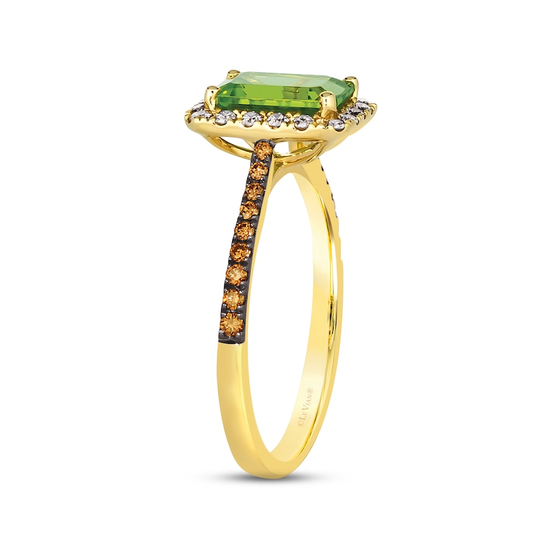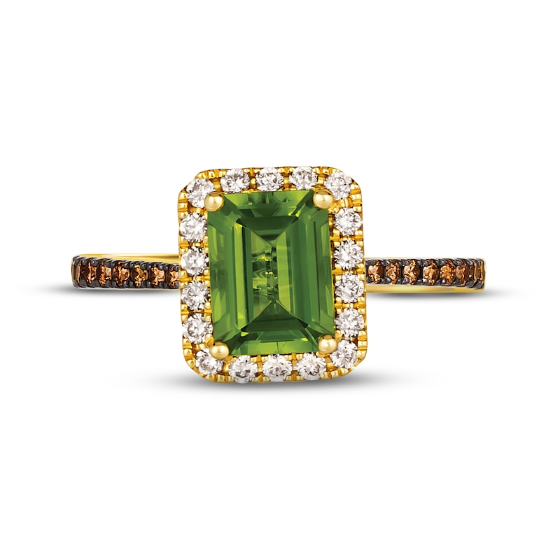 This succulent Le Vian Creme Brulee® ring showcases a juicy emerald-cut Green Apple Peridot™ framed in shimmering Nude Diamonds™. Rich Chocolate Diamonds® adorn the band, which is crafted in warm 14K Honey Gold™. The ring has a total diamond weight of 3/8 carat. Le Vian®. Discover the Legend. This ring is available in limited sizes. If you don't see your size here, please visit a store to order your ring.