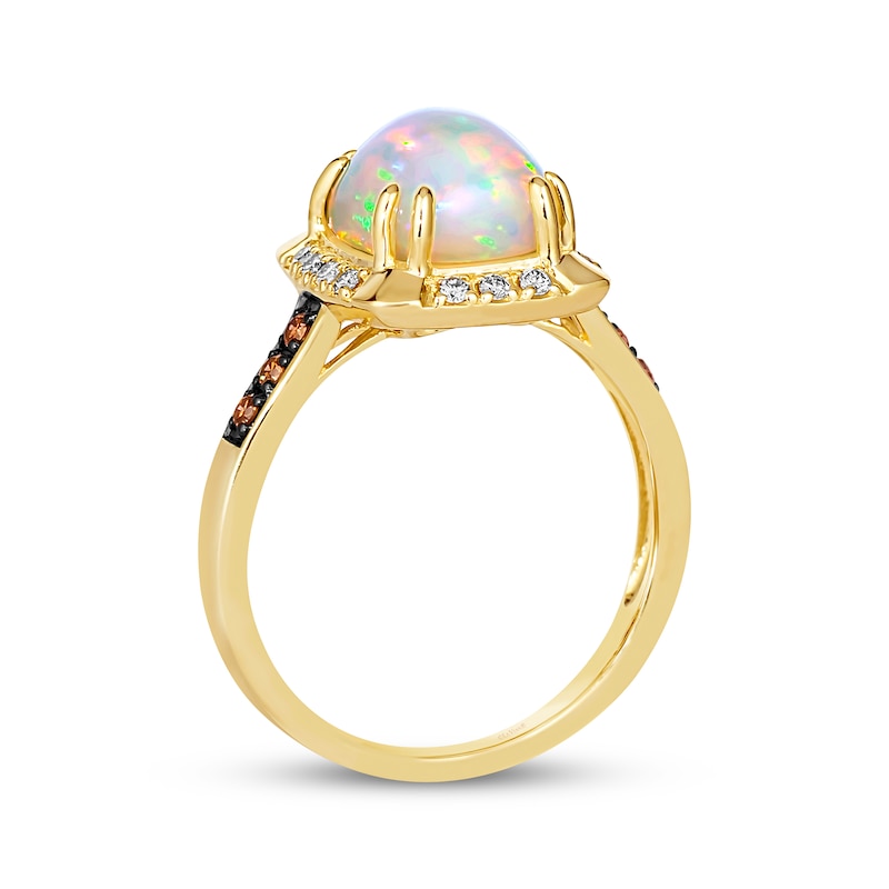 Sumptuous and stylish, this Le Vian® ring centers a breathtaking cushion-cut Neopolitan Opal™ styled in warm 14K Honey Gold™. Nude Diamonds™ frame the luscious gemstone, while Chocolate Diamonds® gleam on the band for a rich contrast. The ring has a total diamond weight of 1/5 carat. Le Vian®. Discover the Legend. This ring is available in limited sizes. If you don't see your size here, please visit a store to order your ring.