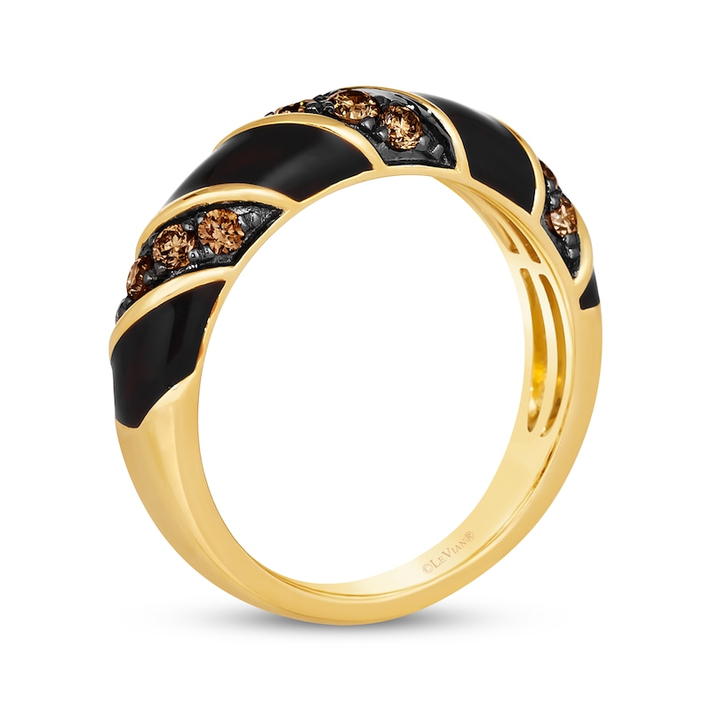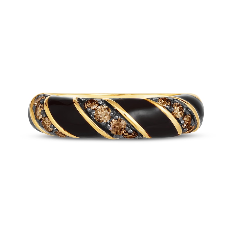 Sleek black enamel is a delicious twist in this ring from Le Vian®. Rich round-cut Chocolate Diamonds® in black rhodium plate are set on the diagonal in between polished and enameled twists. The ring is styled in 14K Honey Gold™ and has a total diamond weight of 3/8 carat. Le Vian®. Discover the Legend. This ring is available in limited sizes. If you don't see your size here, please visit a store to order your ring.