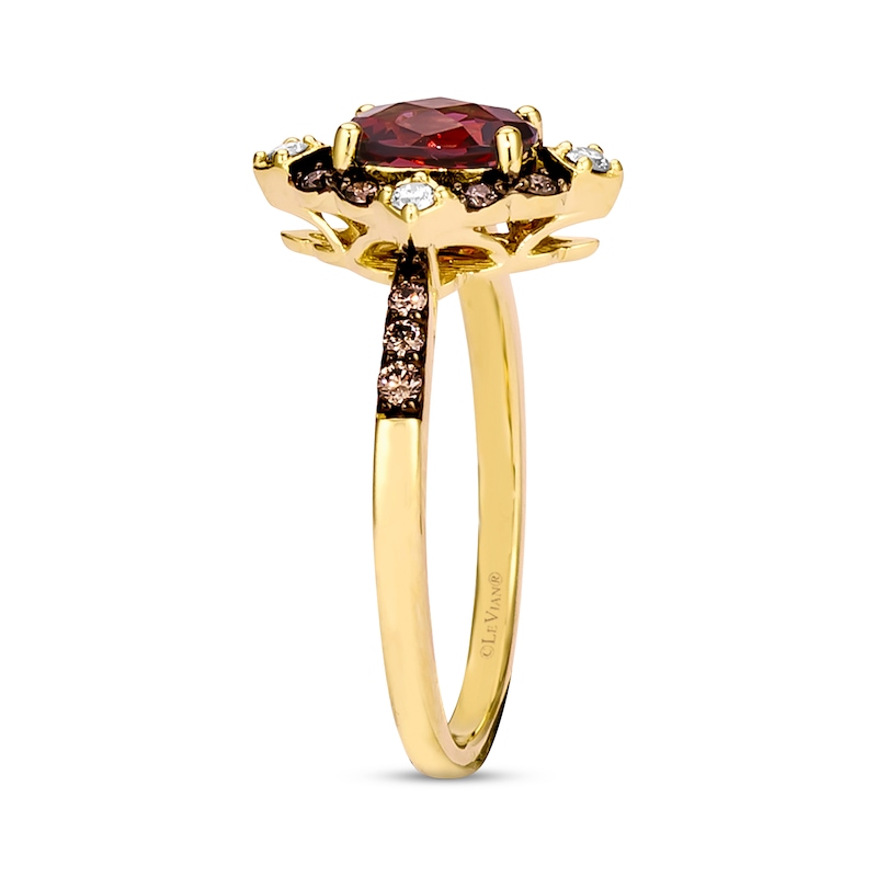 This dreamy ring from Le Vian® showcases a delicious oval-cut Raspberry Rhodolite® at its center, surrounded by a tempting frame of Chocolate Diamonds® and Nude Diamonds™. More rich Chocolate Diamonds® frost the sides of the band for a total diamond weight of 1/5 carat. The ring is set in sweet 14K Honey Gold™. Le Vian®. Discover the Legend. This ring is available in limited sizes. If you don't see your size here, please visit a store to order your ring.