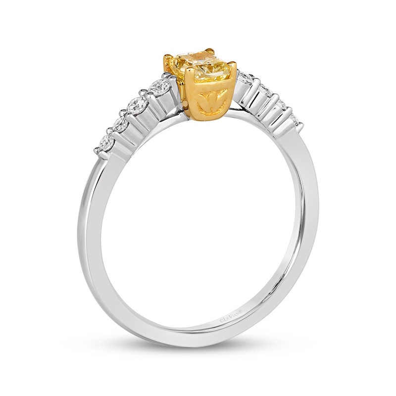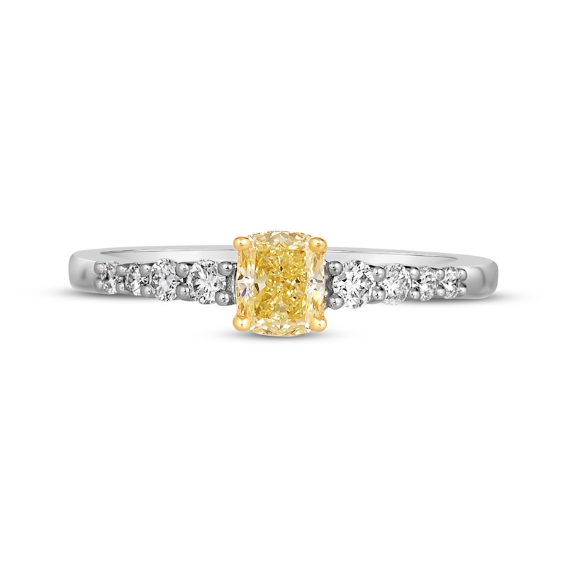 Oozing optimism, this Le Vian® Sunny Yellow Diamonds® ring showcases a brilliant 1/2-carat cushion-cut yellow diamond set in 14K Honey Gold™ at the center. Sweet round-cut Vanilla Diamonds® drizzle the sides of the 14K Vanilla Gold® setting. The ring has a total diamond weight of 5/8 carat. Le Vian®. Discover the Legend. This ring is available in limited sizes. If you don't see your size here, please visit a store to order your ring.