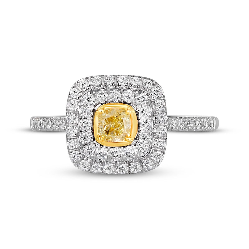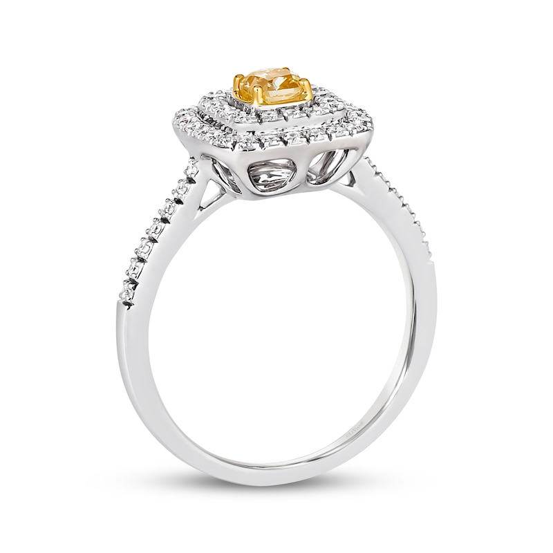 Resplendently irresistible, this Le Vian® Sunny Yellow Diamonds® ring showcases a 1/3-carat cushion-cut yellow diamond that gleams amid 14K Honey Gold™ at the center. Vanilla Diamonds® styled in cool 14K Vanilla Gold® provide a stunning contrast on the cushion-shaped surround. The ring has a total diamond weight of 5/8 carat. Le Vian®. Discover the Legend. This ring is available in limited sizes. If you don't see your size here, please visit a store to order your ring.