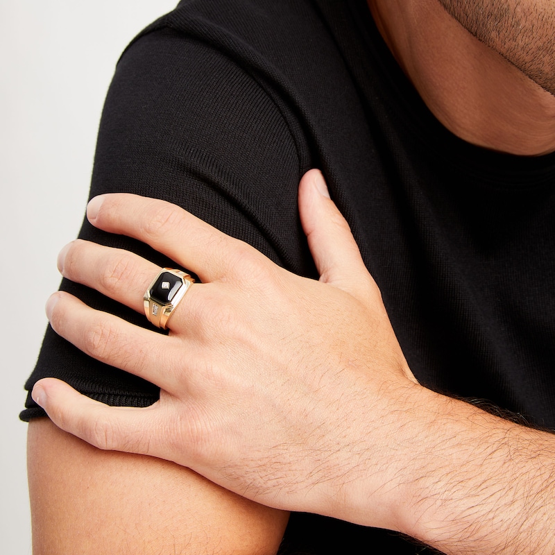 This stunning ring for him is crafted in 10K yellow gold and features an intense emerald-cut black onyx. Bright round diamond accents are styled in white rhodium for a hint of sparkling contrast.