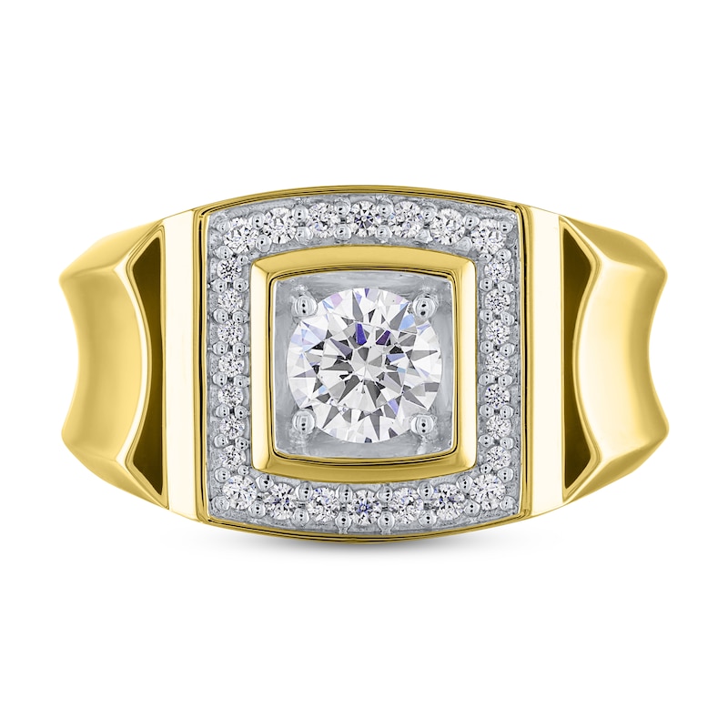 A radiant 3/4-carat round lab-created diamond draws the eye to this magnificent ring for him, which is styled in timeless 14K yellow gold. Additional round lab-created diamonds adorn the striking square design at the center, bringing the total lab-created diamond weight to 1 carat. Each lab-created diamond is independently certified. From the Lab-Created Diamonds by KAY.