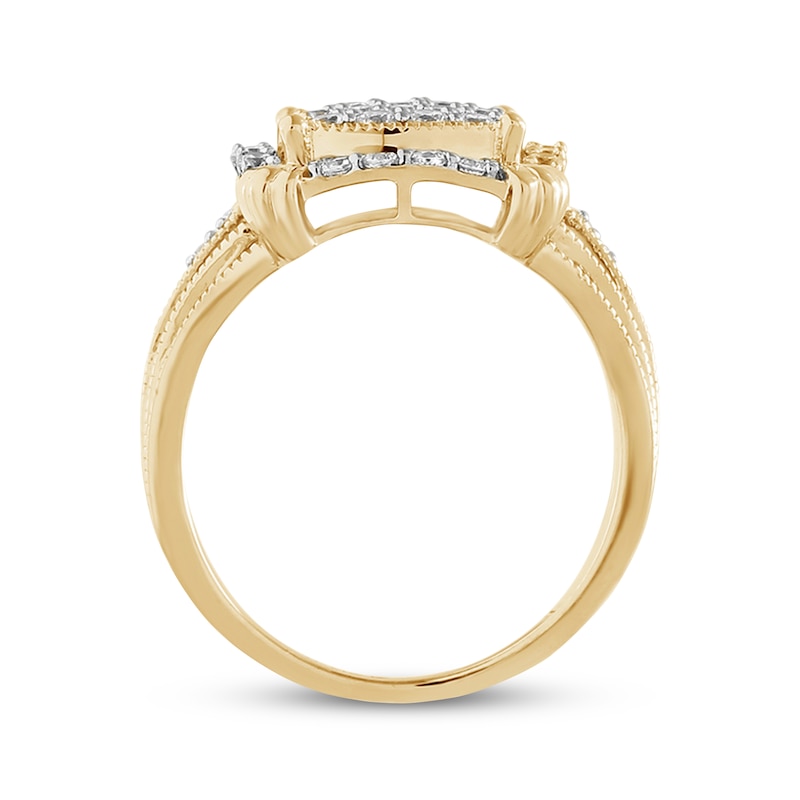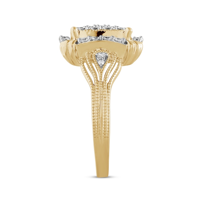 A cluster of sparkling round-cut diamonds forms the center of this eye-catching ring for her. More brilliant round-cut diamonds frame the center and embellish each side of the band for a total diamond weight of 3/4 carat. The ring is set in timeless 10K yellow gold and features rhodium flashes. Milgrain detailing finishes the look. Available online while supplies last. Previously Owned Treasures are not eligible for in-store pickup. Previously Owned Treasures may only be shipped either to your home address or to an alternate address.