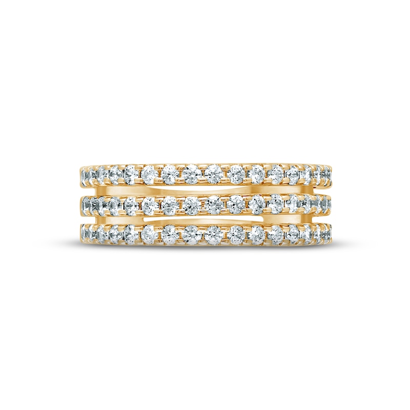 Three rows of shining round diamonds give this glamorous anniversary ring a stylish stacked appearance. Crafted in 14K yellow gold, the ring has a total diamond weight of 3/4 carat. From the Now and Forever® bridal collection.