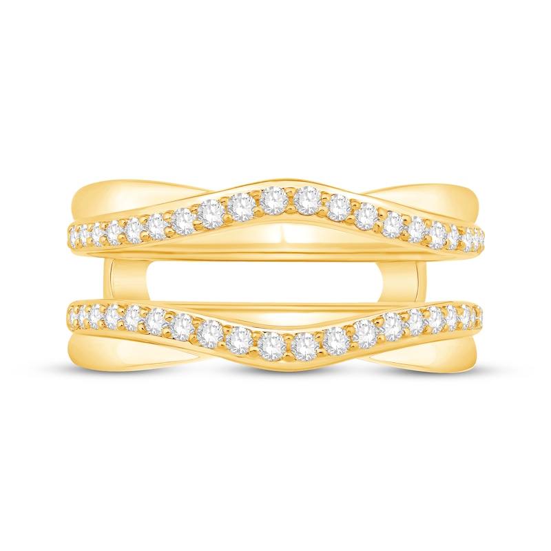 She'll love the way this ring enhancer wraps around her diamond solitaire (sold separately). Curved ribbons of round diamonds and angled polished bands come together to create a beautiful look. Crafted in 14K yellow gold, this enhancer has a total diamond weight of 3/8 carat.