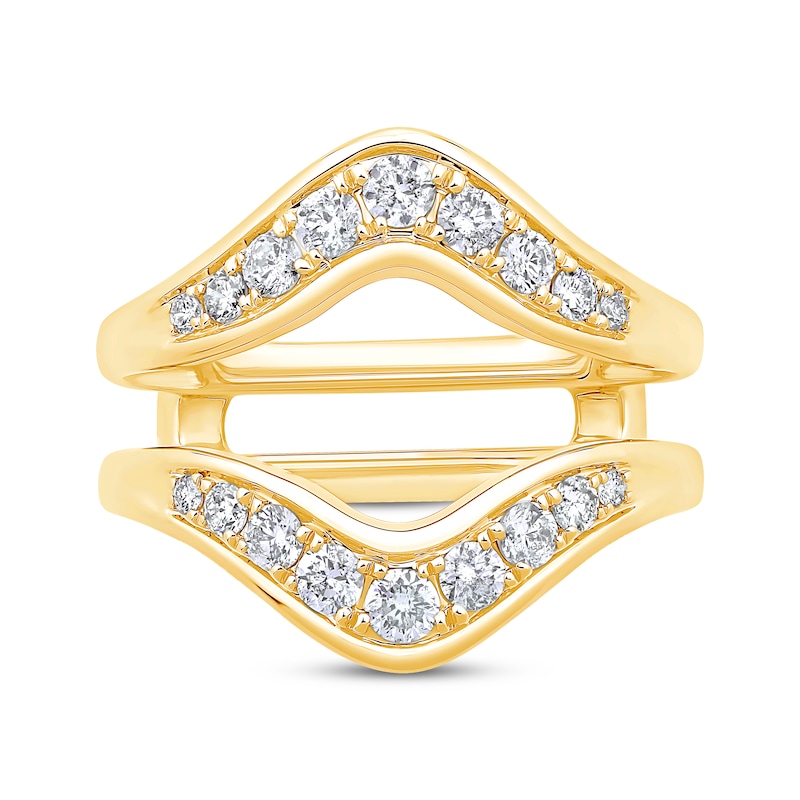 Your engagement ring (sold separately) is made new with this sparkling enhancer ring. Crafted in 14K yellow gold, the chevron style shimmers with round-cut diamonds on both sides for a total diamond weight of 5/8 carat. From the Now & Forever® bridal collection.