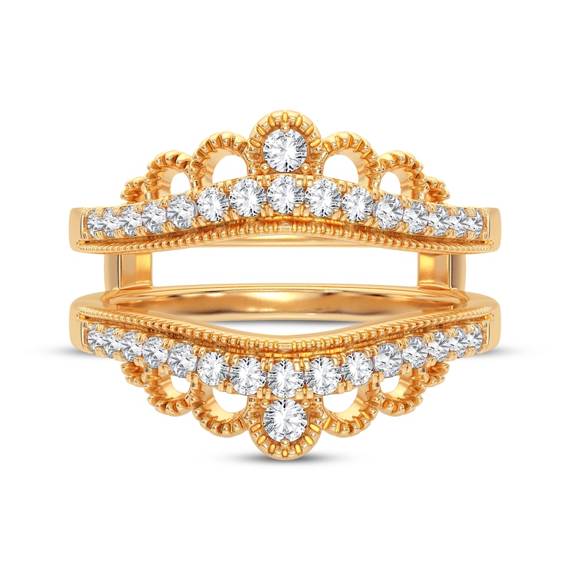Dress up her engagement ring (sold separately) with this vintage-inspired enhancer ring. The contoured top and bottom bands are lined with dazzling round diamonds. Scallops of milgrain detailing lend heirloom appeal. The ring is styled in 14K yellow gold and has a total diamond weight of 3/8 carat. From the Now & Forever® bridal collection.