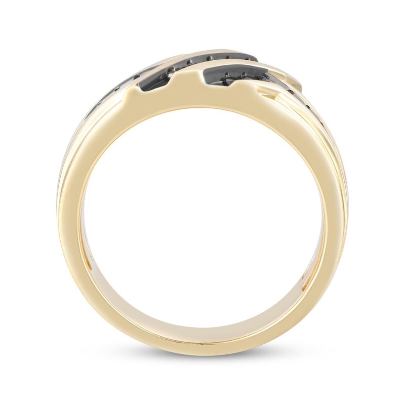 Rich with color and pattern, this wedding band is a stylish choice. The exciting design showcases ribbons of black and brown round-cut diamonds in black rhodium-touched channels in the sculpted shank. Crafted in polished and satin-finished 10K yellow gold, this wedding band has a total diamond weight of 1/3 carat.