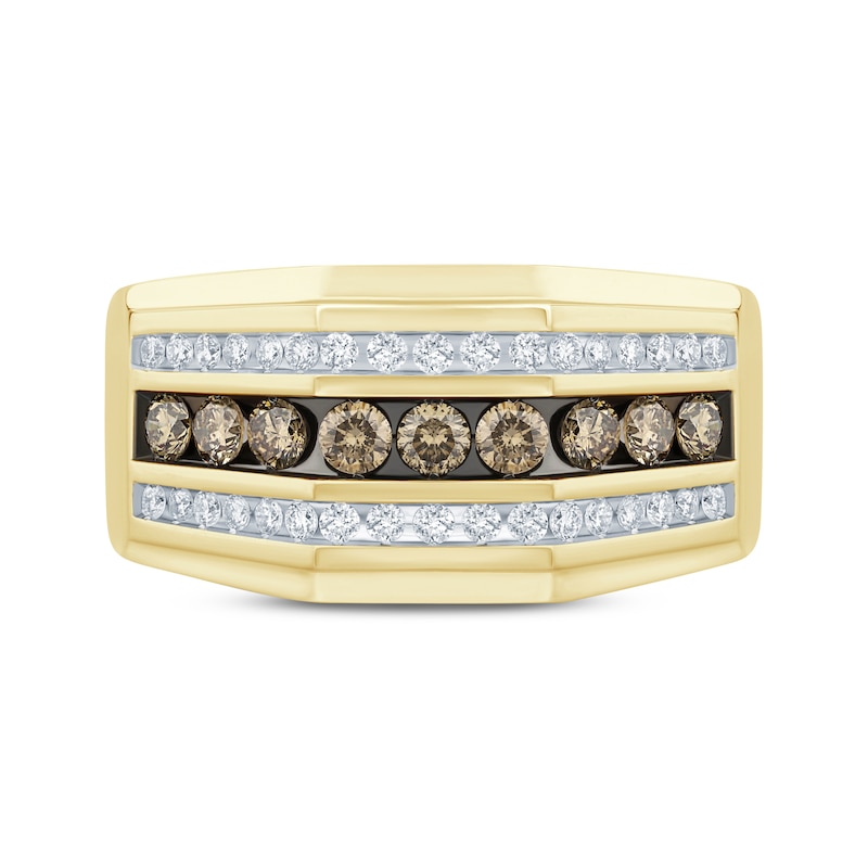 He'll love the distinctive shape and color of this dramatic diamond wedding band. Along the center channel, round brown diamonds in black rhodium plate are flanked by channels of round white diamonds in white rhodium plate, for a total diamond weight of 1 carat. The angled band in 10K yellow gold lends interest to this bold and masculine design. From the Now & Forever® collection.