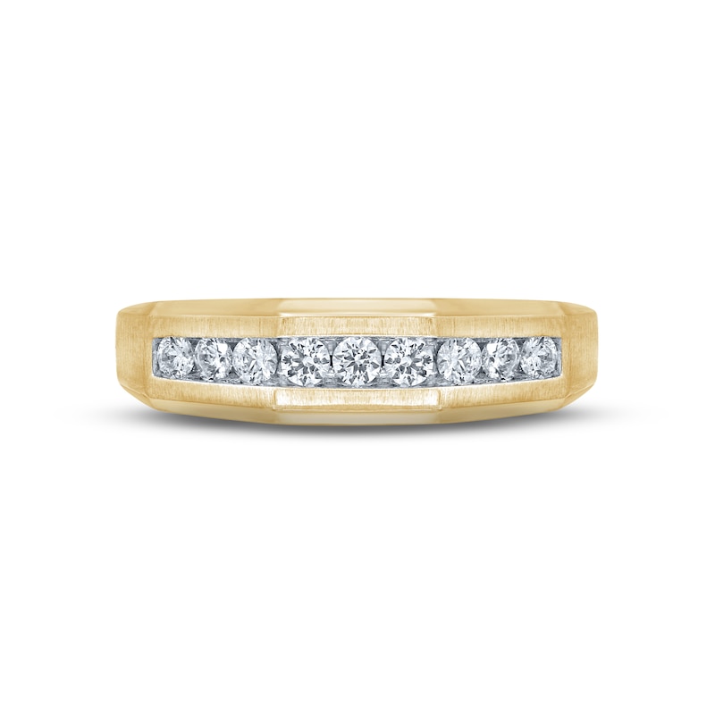 This commanding wedding band for him is fashioned in timeless 10K yellow gold with sparkling round diamonds shining in white rhodium for a striking contrast. The angled band has a total diamond weight of 1/2 carat. From the Now and Forever® collection.