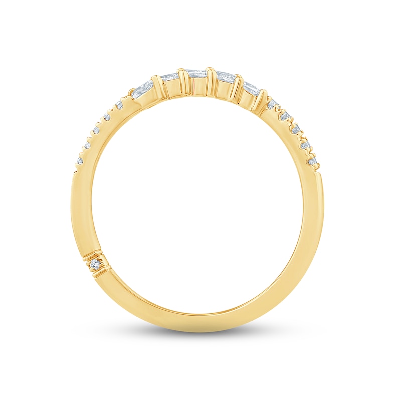 Win her heart all over again with this exceptional anniversary band. Styled in 18K yellow gold, five dazzling marquise-cut diamonds sparkle at the center, while brilliant round diamonds grace both sides of the band. The ring has a total diamond weight of 1/4 carat, and the diamonds are independently certified. From the Monique Lhuillier Bliss collection, available exclusively at KAY. Please note: This ring is available in limited sizes. If you don't see your size here, please visit a store to order your ring.