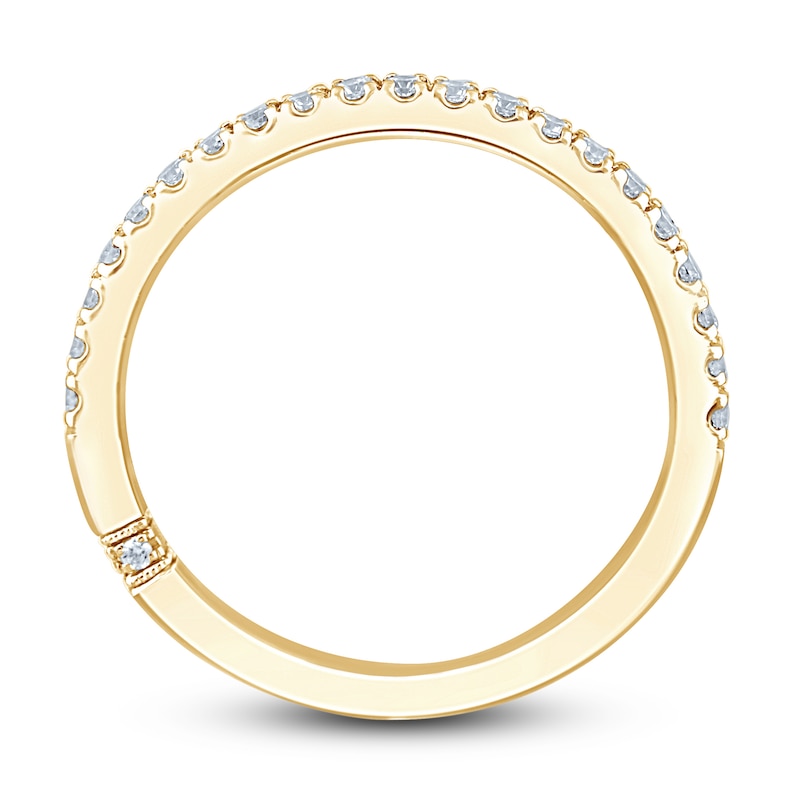 This chic anniversary band features a timeless design set in 18K yellow gold. Brilliant round independently-certified diamonds sparkle in a row for a total diamond weight of 1/4 carat. From the Monique Lhuillier Bliss collection, available exclusively at KAY. Please note: This ring is available in limited sizes. If you don't see your size here, please visit a store to order your ring.