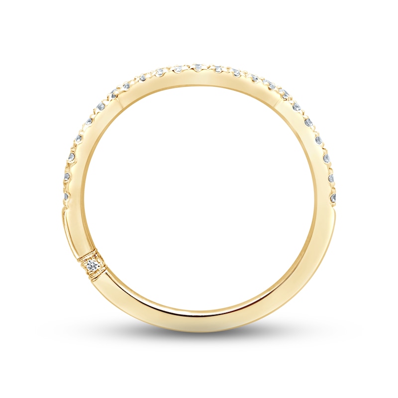 Sparkling independently-certified round diamonds adorn the contours of this beautiful 18K yellow gold wedding band. Crafted to pair with her matching engagement ring (sold separately), the band has a total diamond weight of 1/5 carat. From the Monique Lhuillier Bliss collection, available exclusively at KAY. Please note: This ring is available in limited sizes. If you don't see your size here, please visit a store to order your ring.